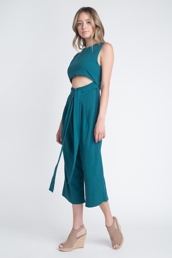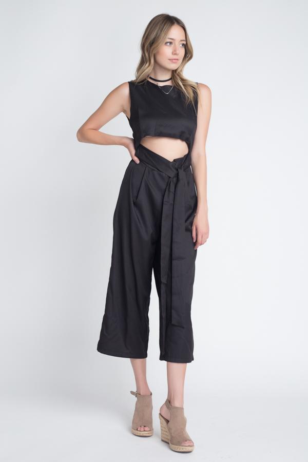 This sleeveless jumpsuit features a slit and a tie detail